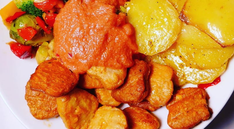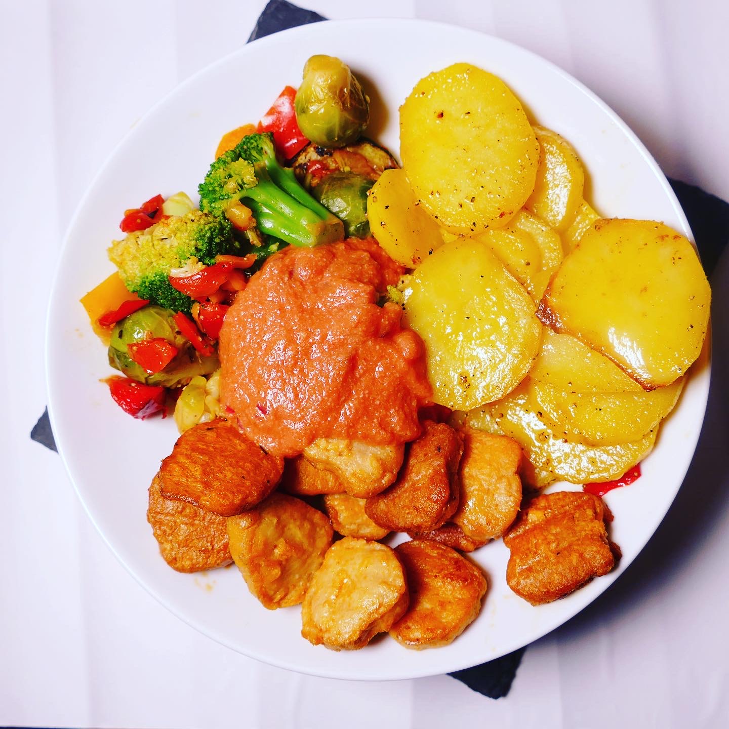 Die Snack Bites lassen sich auch vielfältig nutzen. Ich hatte einfach ein paar Ofenbratkartoffeln, Gemüse und eine leckere Tomaten-Srirache-Tahini-Sauce dazu.