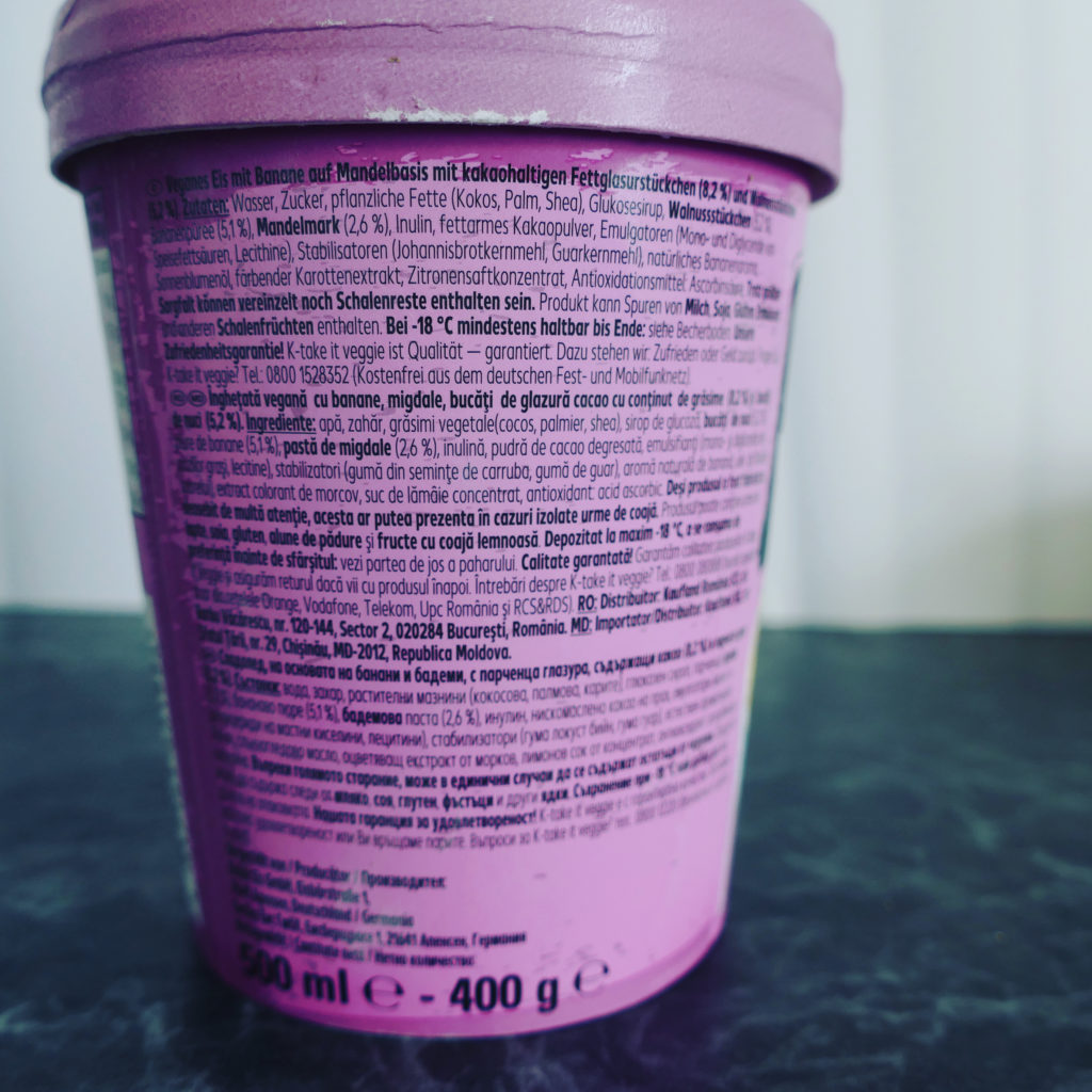 Schaut man sich die Zutaten, fragt man sich schon, warum das ein Eis auf Mandelbasis ist, wenn doch zu allererst Wasser und Zucker genannt werden. Dicht gefolgt von pflanzlichen Fetten (Kokos, Palm und Shea) sowie Glukosesirup. Dann kommen Walnussstückchen, Bananenpüree und mit nicht mal 3% Mandelmark.